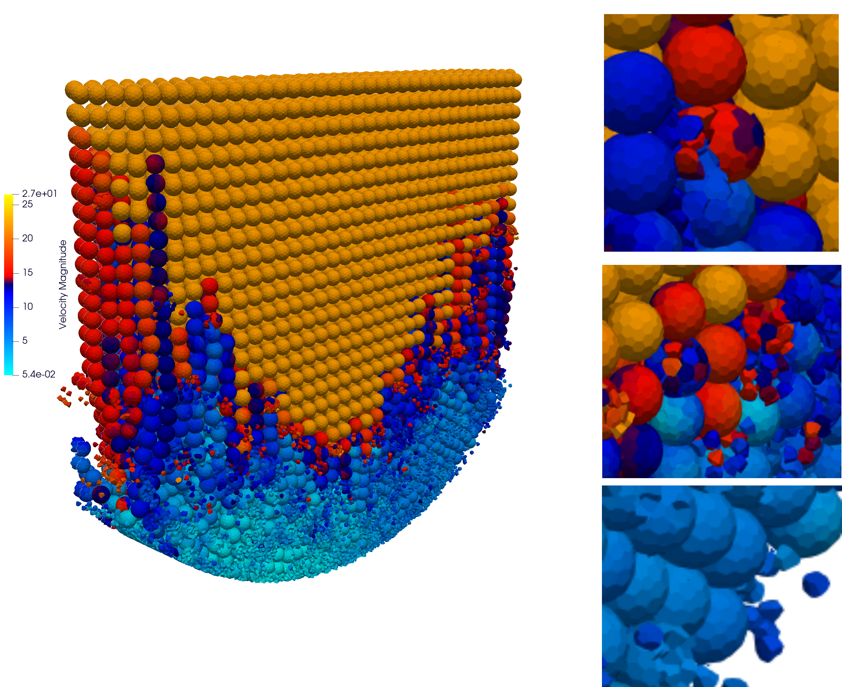 The strategy for handling fragmentation in exaDEM consists of pre-cutting the grains into small polyhedrons and adding springs between the opposite vertices for the faces to be bonded. To use these developments, you must include the config_fragmentation.msp file instead of config_polyhedra.msp.