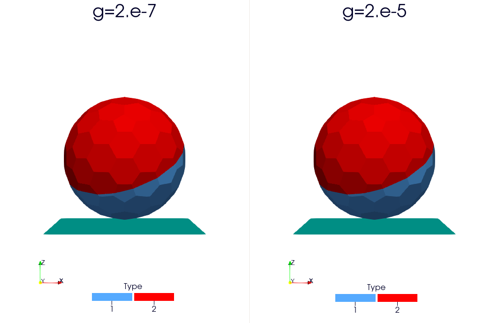 It’s important to note that using a shape of a spherical particle with a polyhedron configuration instead of directly using a sphere configuration decreases overall performance due to unnecessary calculations, such as applying an orientation to a vertex. We have observed that in this case, simulations are about 2 to 3 times slower.